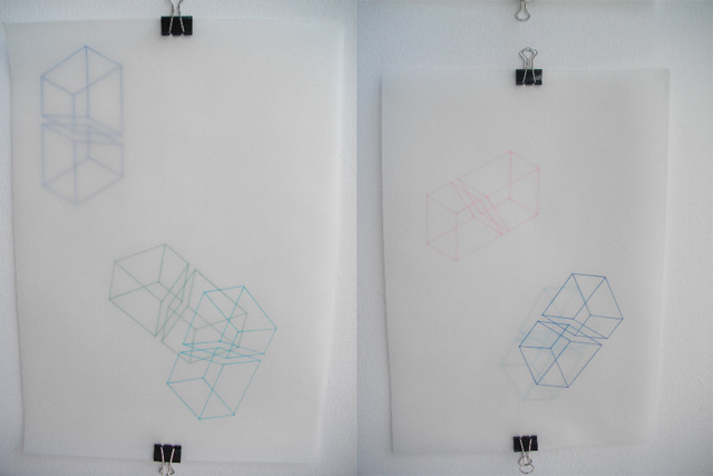 The artist even succeeds interestingly in introducing depth to this work by layering one drawing over another, the bright ink from the background drawing only a little dimmed through the foreground sheet. Another drawing in this show becomes more performatively architectural by occupying a conspicuous spot of the gallery building: A tower of ink lines rises in a stairwell. A modest architectural behemoth that can be rolled up and tucked away in a wardrobe. Imagination and ambition that doesn’t increase our national debt.